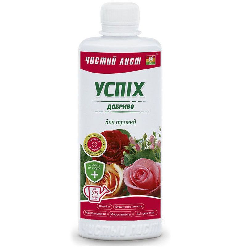Успех для роз - данное комплексное удобрение является специализированным. В составе содержит все необходимые макро- и микроэлементы в хелатной и сбалансированной форме. После внесения препарата угнетается рост патогенов, стимулируется более сильное развитие корневой системы и повышается естественная стойкость растений перед заболеваниями.