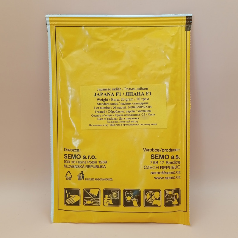 Япана F1 – гибрид редьки. Является среднеспелым, для летнего посева. Плод цилиндрический, длина: около 30-35 см, диаметр – 6 см; гладкая поверхность. Имеет белую, сочную, вкусную мякоть. Растение устойчиво к стрелкованиям, растрескиваниям. Предназначена для свежего потребления, хранения. Растет на легких, подготовленных почвах.