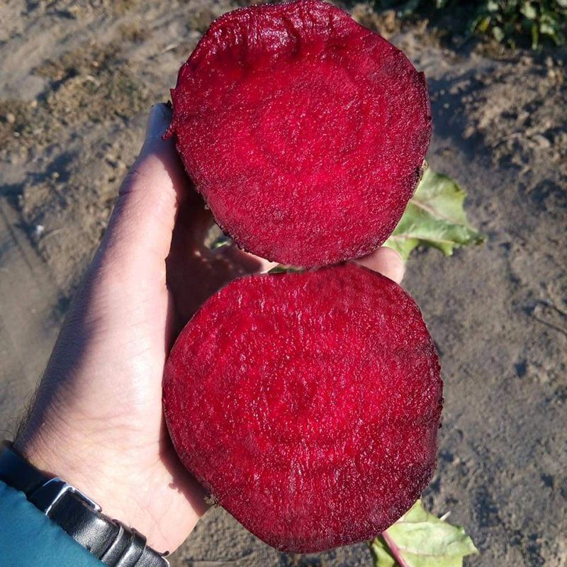 Характеристика плодов – Корнеплоды имеют круглую, гладкую, одинаковую форму, темно-красную окраску без колец снаружи. Вес – 250 г.