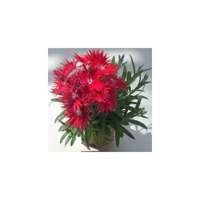 Высота в горшке 15-20 см, ширина - 20-25 см. Ажурные цветы красного цвета.
