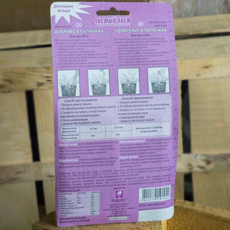 Чистый лист (для орхидей) - данное удобрение представлено в виде палочек. Является препаратом с длительным действием. Обеспечивает полноценную подпитку всеми необходимыми микро- и макроэлементами на протяжении 3-х месяцев. Своим воздействием улучшает рост и формирование растений, также улучшает внешний вид.
