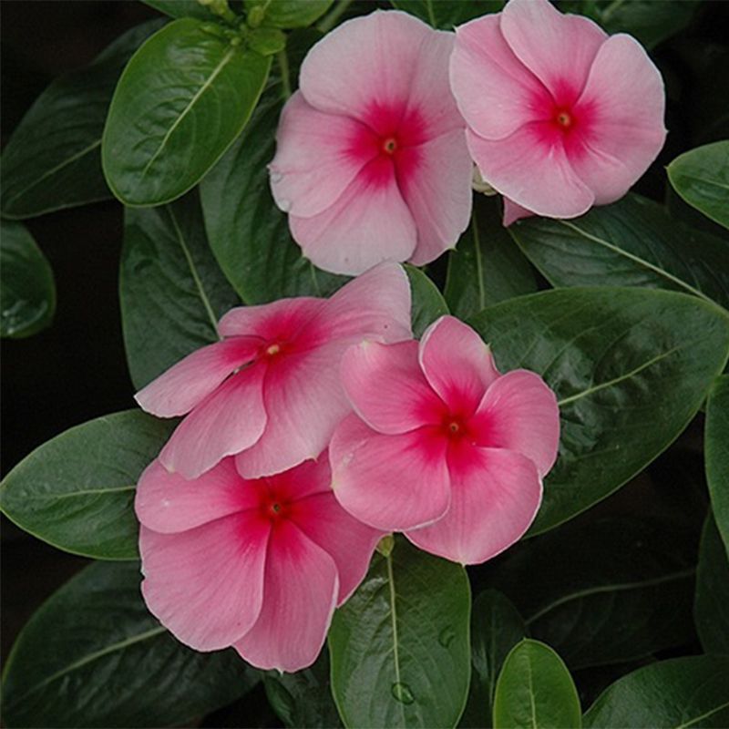 Цветы в катарантуса Sunstorm очень яркие и большие, листва темно-зеленая блестящая.
