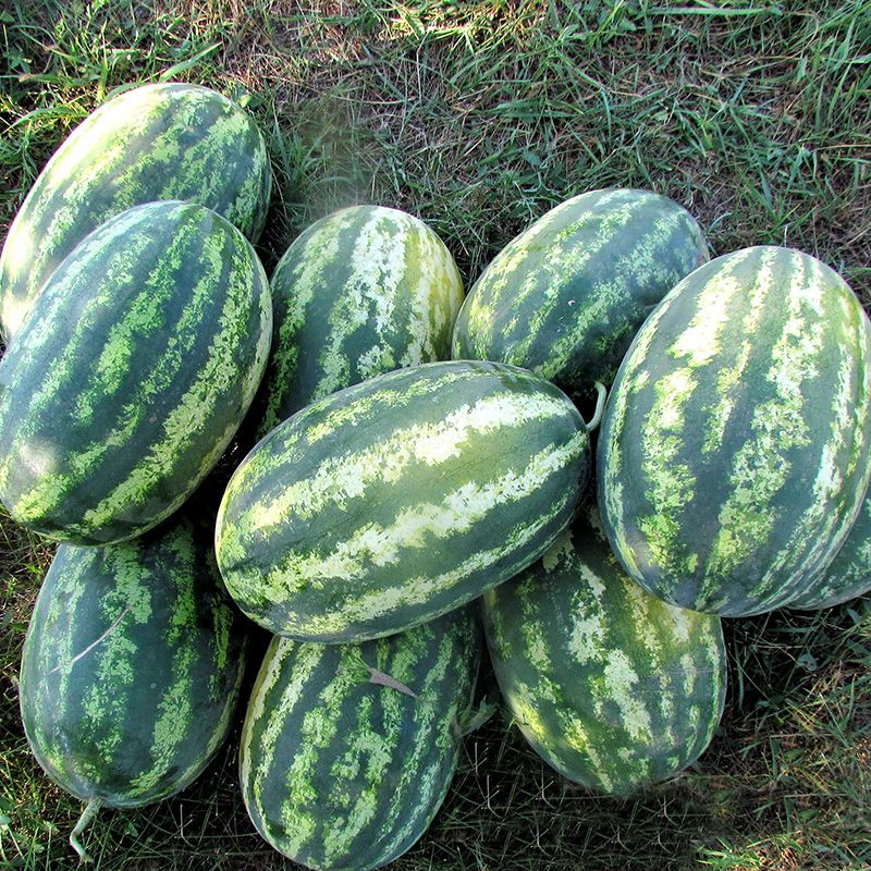 Характеристика плодов – Плоды овальной формы, с размытыми полосами на более светлом фоне. Средняя масса – 8-12 кг. Мякоть нежная, вкусная, сладкая, насыщенного красного цвета, без волокон.