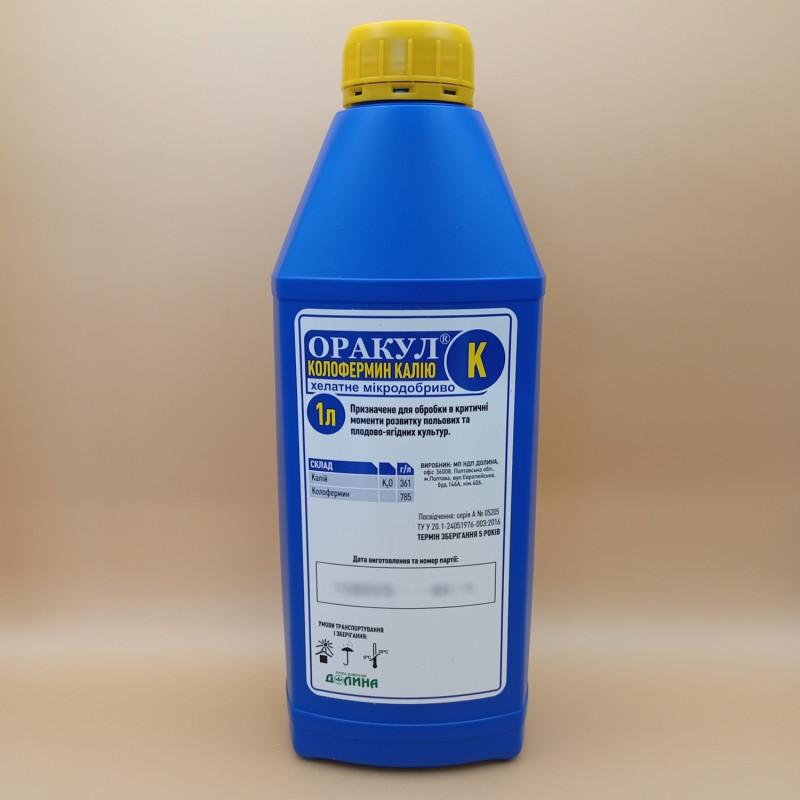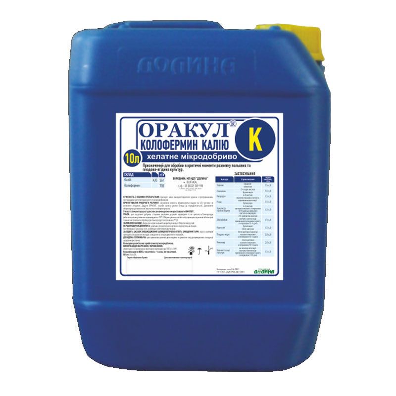 Оракул колофермин калия - это микроудобрение с повышенным содержанием калия. Используется на полевых, плодовых и ягодных культурах нуждающихся в дополнительном внесении калия. В своем составе не содержит азот, благодаря чему достигается отличное внесение калия на последних фазах развития растений.