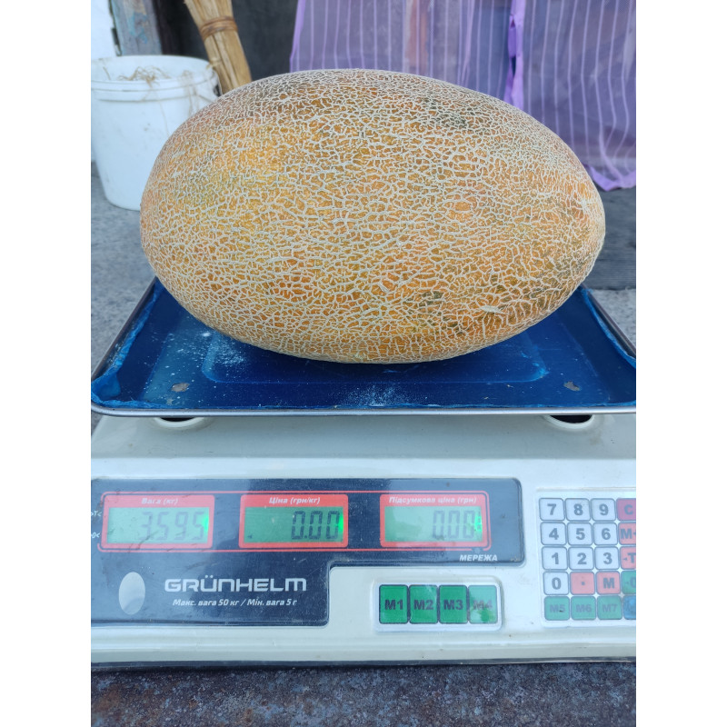 Средние по размерам плоды, с твердой кожурой, коричневато-зеленого цвета, с темно-зелеными пятнами и светлыми полосками. Вес одной дыни, примерно, 2,2-2,5 кг. Белоснежная, сахаристая мякоть. Отличный товарный вид и приятный вкус.