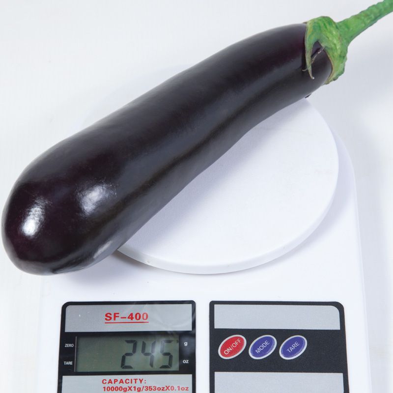 Однородные плоды имеют цилиндрическую форму и темно-фиолетовый цвет. Длина плода: 18-20 сантиметров, масса плода: 200-250 грамм. Кремово-белая мякоть по структуре плотная и без горечи. Отличается отличными вкусовыми качествами и способностью завязывать плоды даже при жарких условиях.
