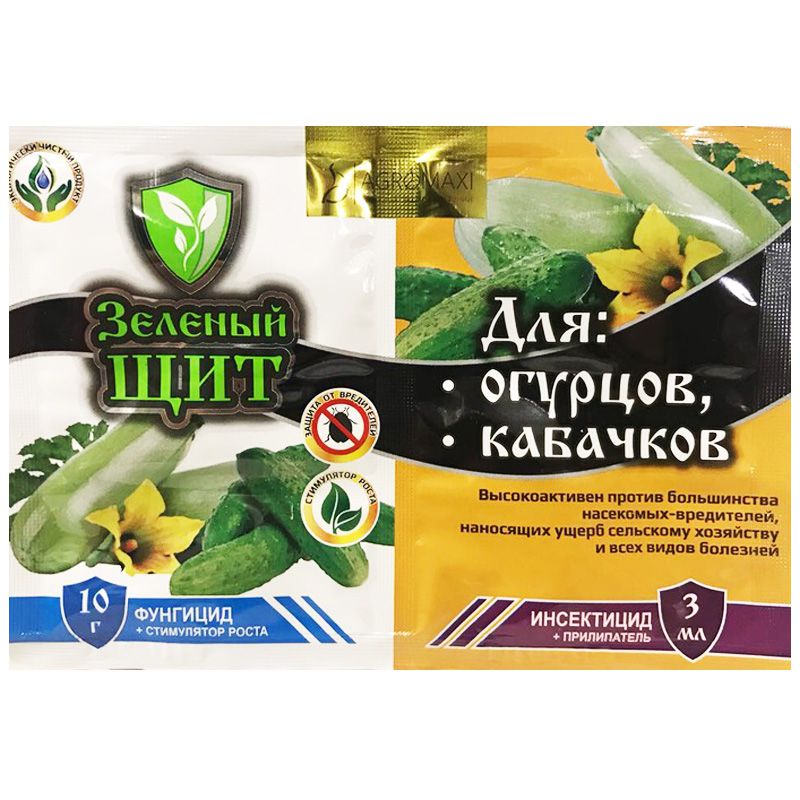 Зеленый щит для огурцов и кабачков - комплексный препарат имеющий в своем составе инсектицид, фунгицид, прилипатель и стимулятор роста. Препарат неорганического происхождения со сплошным воздействием. Своим воздействием защищает культуры от многих вредителей и заболеваний. Благодаря наличию в составе стимулятора роста повышает ростовые процессы растений. Прилипатель улучшает обработку препаратом.