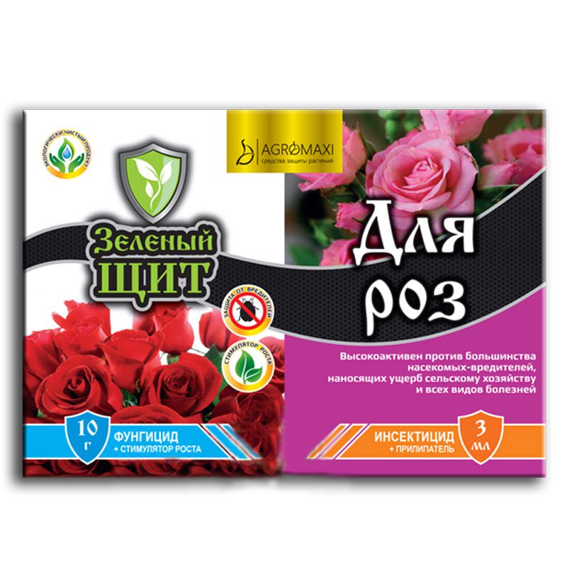 Зеленый щит для роз - комплексный препарат имеющий в своем составе инсектицид, фунгицид, прилипатель и стимулятор роста. Препарат неорганического происхождения со сплошным воздействием. Своим воздействием защищает культуры от многих вредителей и заболеваний. Благодаря наличию в составе стимулятора роста повышает ростовые процессы растений. Прилипатель улучшает обработку препаратом.
