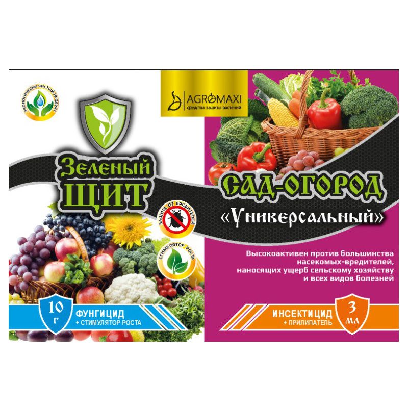 Зеленый щит Сад-Огород универсальный - комплексный препарат имеющий в своем составе инсектицид, фунгицид, прилипатель и стимулятор роста. Препарат неорганического происхождения со сплошным воздействием. Своим воздействием защищает культуры от многих вредителей и заболеваний. Благодаря наличию в составе стимулятора роста повышает ростовые процессы растений. Прилипатель улучшает обработку препаратом.