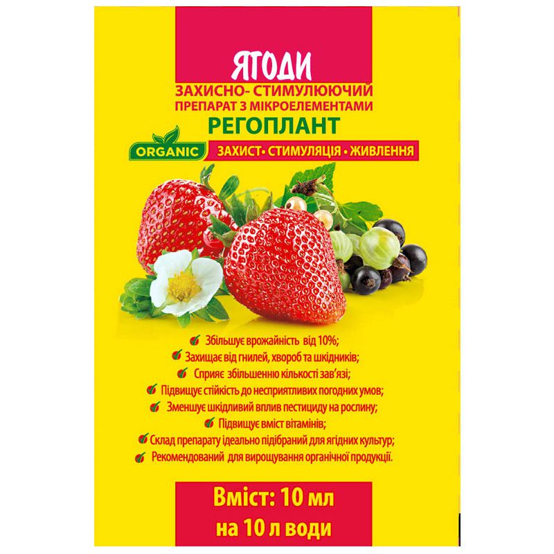 Регоплант Ягоды - регулятор роста разработанный специально для внесения на насаждения ягодных растений. Своим воздействием препарат активирует процессы дыхания и питания растений, не допускает появление и развитие заболеваний. Также повышает развитие корневой системы и листового аппарата. У растений улучшается стойкость к негативным климатическим условиям. Препарат довольно быстро попадает в растение - 2-3 часа.