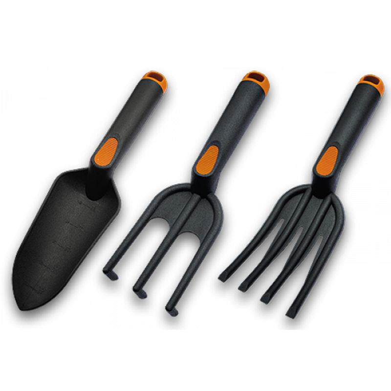 Комплект садовый из трех элементов Bradas - состоит из рыхлителя, садовой вилки и лопатки широкой. Инструменты выполнены из качественного и прочного пластика.