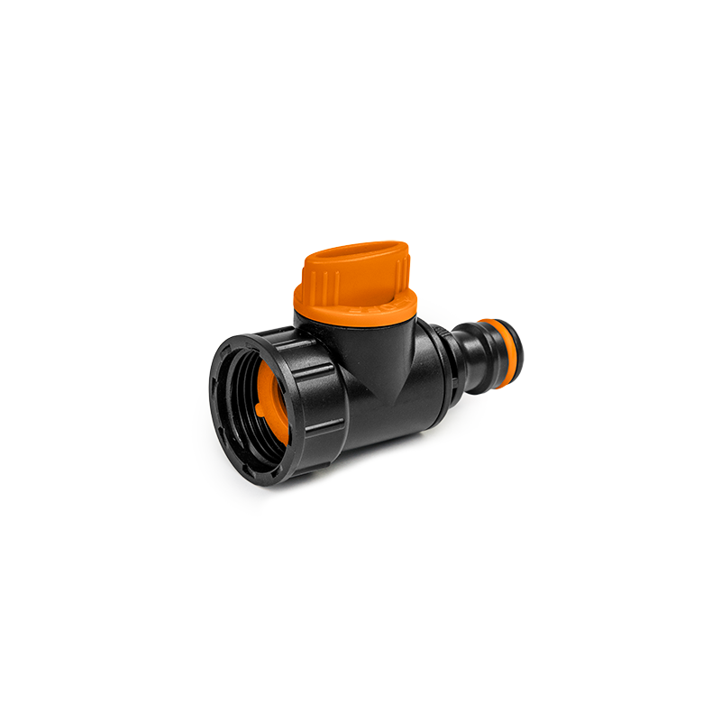 Адаптер оснащен внутренней резьбой для накручивания на кран 3/4", ниппелем для соединения с коннектором и краном для автономного перекрывания воды.
