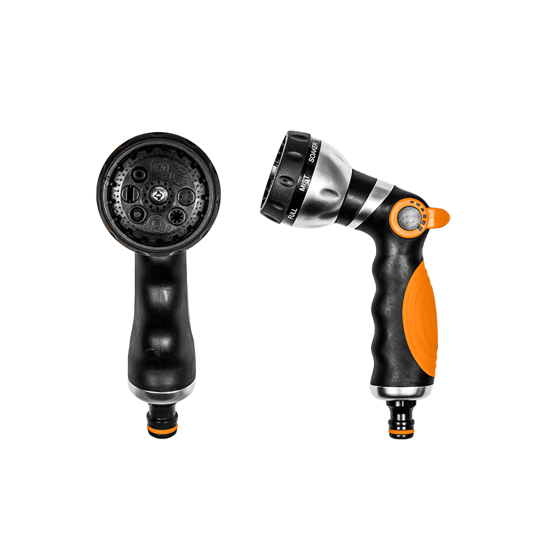 Эргонометричный металлический пистолет для полива с плавной регулировкой напора воды.