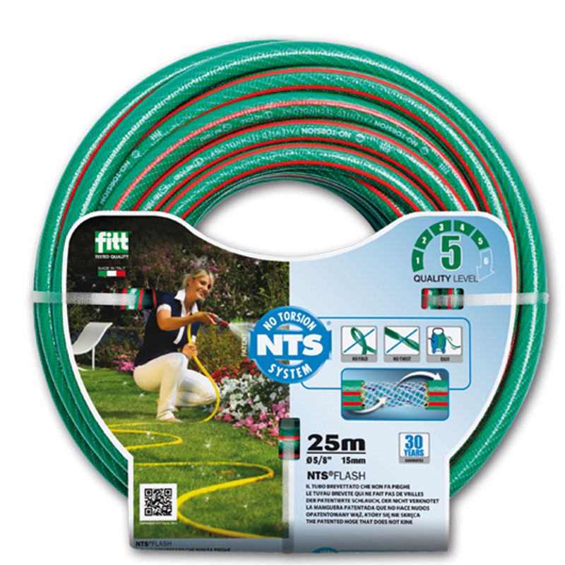 Шланг поливочный пятислойный. Армирован прочной полиэстеровой оплеткой инновационной системы NTS® (Non-Torsion System), которая предотвращает перекручивание и заламывание шланга. Шланг изготовлен из высококачественного эластичного ПВХ. Устойчив к негативному воздействию UV излучения и интенсивному нарастанию водорослей внутри шланга (дополнительный черный слой).