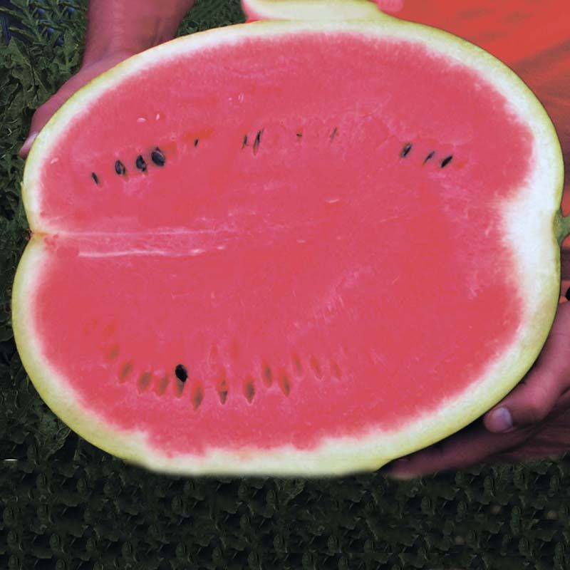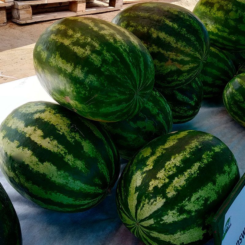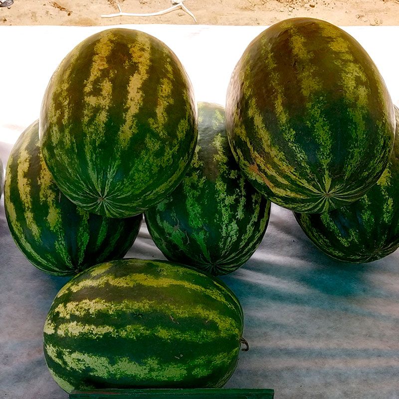 Плоды формируются крупного размера и округлой формы, темно-зеленого цвета с полосами, массой 13-15 кг, с красной хрустящей мякотью.