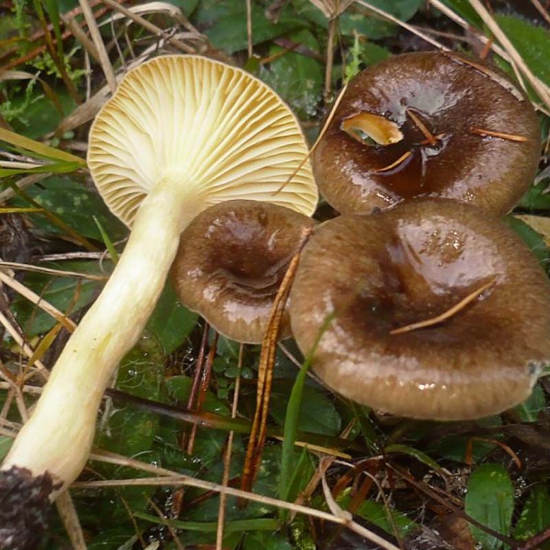 Небольшой по своим размерам гриб. Шляпка в диаметре около 2-5 см, в начале роста плоской формы, позже приобретает воронкообразную форму. Цвет у шляпки тёмно-жёлтый либо коричневый, у молодых грибов оливковый. Поверхность обильно покрыта слизью, гладкая.