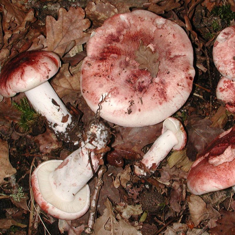 Споры гриба окрашены в белый цвет. Ножка в высоту растёт от до 8 см, толщина около 1-4 см., слегка сужается, окрашена в белый цвет, иногда с пятнами розового цвета. Поверхность гладкая и сухая.