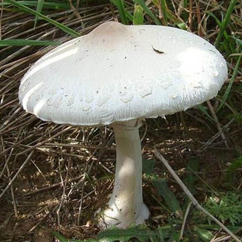 Гриб-зонтик относится к семейству шампиньонов. Гриб относится к съедобным грибам, обладает прекрасным ароматом и вкусом. Шляпка гриба, мясистая, плотной структуры, в начале своего роста по форме напоминает яйцо, позже имеет распростёртую форму, по центру находится небольшой бугорок. В диаметре шляпка составляет от 6 до 12 см, поверхность шляпки белого или бежевого цвета, матовая, по которой располагаются мелкие чешуйки. Края шляпки имеют белые волокна. Мякоть гриба окрашена в белый цвет, волокнистой структуры, цвет не меняет на месте среза, обладает приятным запахом и немного тёрпким вкусом. Высота ножки составляет от 6 до 12 см., в толщину около 0,6 до 1,2 см., продолговатой цилиндрической формы, в середине имеет полости, около основания имеет утолщение. У ножки гладкая поверхность, окрашена в белый или жёлтоватый цвет. Пластинки близко расположены, имеют ровные края, бывают белого или кремового цвета. Споровый порошок также имеет белый окрас.