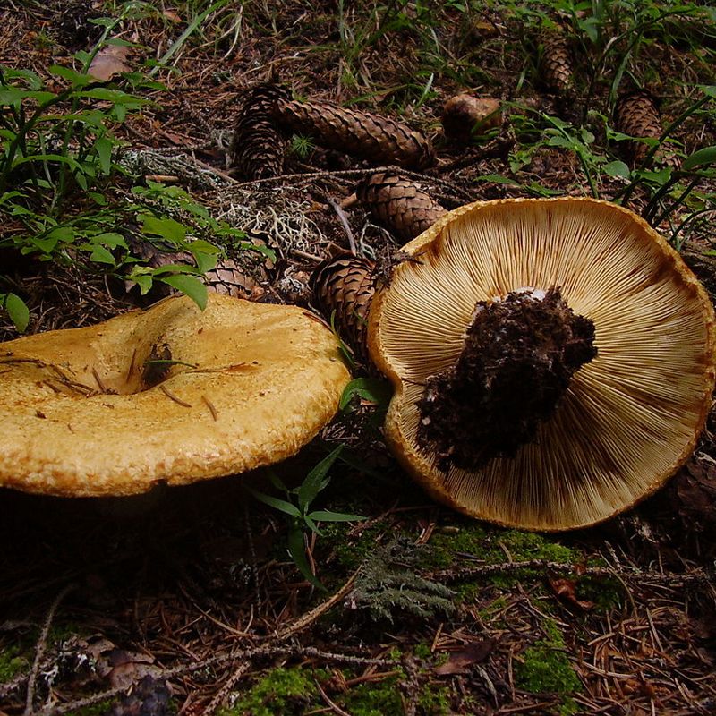 Груздь жёлтый относят к роду Сыроежковые, гриб достаточно крупный, диаметр шляпки составляет от 7 до 25 см., плотной, мясистой структуры. Форма шляпки у молодых грибов объемная, имеет выпуклую форму, со временем приобретает плоскую форму. На поверхности по краям шляпки имеются чешуйки, окраска красноватого оттенка.