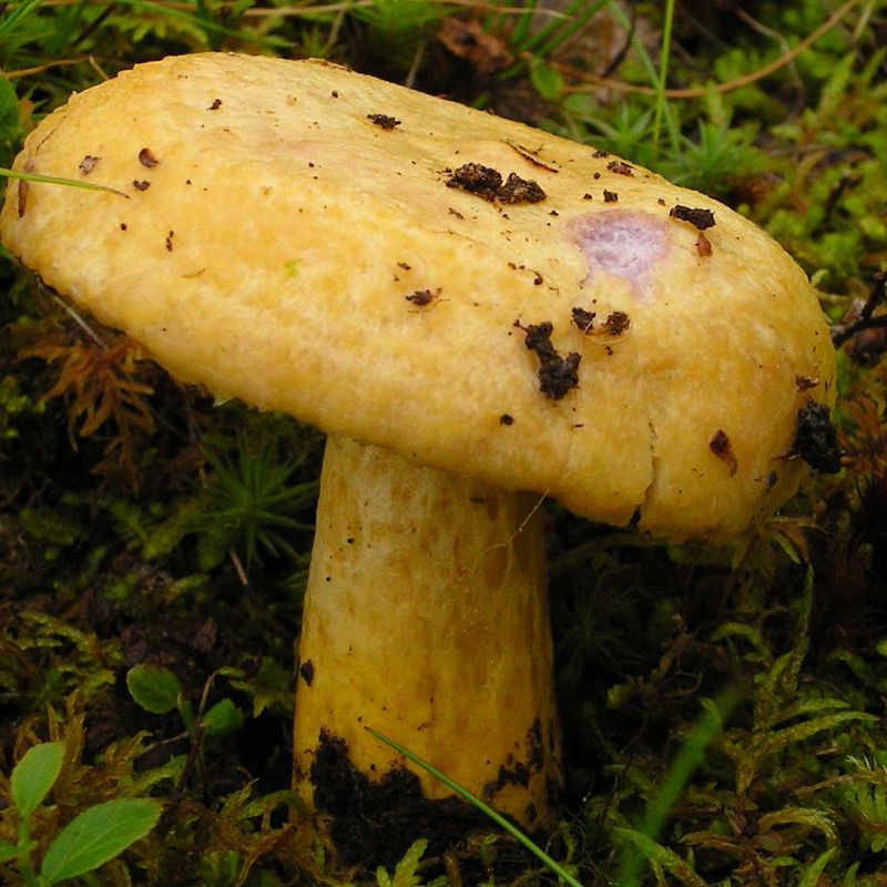 Второе название гриба - Груздь собачий, относится к семейству Сыроежковые. Шляпка покрыта чешуйками которые становятся липкими в сырую погоду, окраска жёлтого цвета, в диаметре шляпка растёт от 6 до 14 см. Форма шляпки сначала выпуклая, позже расправляется в плоскую и позже приобретает форму воронки.
