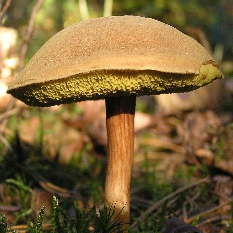 Моховик зелёный относится к наиболее распространённым из рода Моховик. Шляпка Моховика имеет выпуклую форму, по центру находится бугорок, поверхность шляпки бархатная и сухая, может растрескиваться. Окраска шляпки оливкового цвета или жёлтая, слой с трубочками имеет ярко-жёлтую окраску, позже приобретает зеленоватый оттенок.