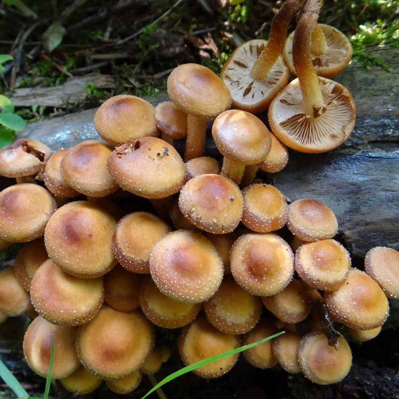 Пластинчатый слой приросший к ножке, пластинки близко расположены, окрашены от светло-коричневого до тёмно-коричневого цвета. Высота ножки около 7 см., в диаметре от 0,8 до 1 см., мякоть плотная, окраска кожицы светлее чем шляпка гриба, у основания имеются тёмного цвета чешуйки. Споры продолговатые и имеют оттенок охры. Плодоношение длится с апреля и до ноября, практически на протяжении всего года. Предпочитает произрастать на пнях и в траве в лиственных лесах около елей. Растёт в больших колониях, предпочтительно в горной местности.