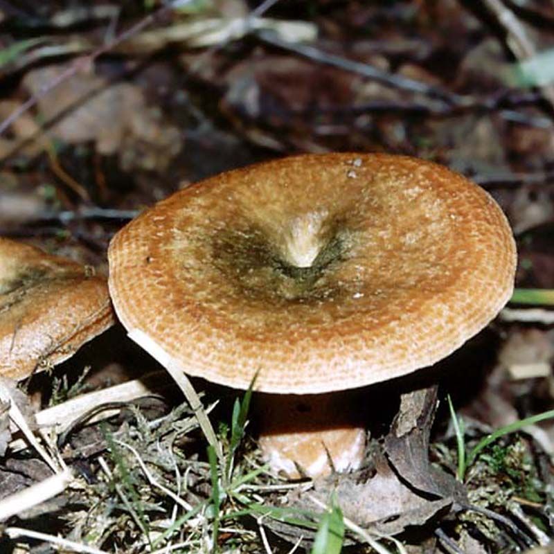 Рыжик относится к семейству Сыроежковые, шляпка гриба в диаметре от 2 до 8 см., имеет выпуклую форму, по центру находится бугорок, со временем становится воронкообразной, края подвёрнуты. Поверхность шляпки гладкая, во время дождя покрывается слизью, имеет оранжевую окраску, присутствуют пятна тёмного оттенка. На месте среза приобретает зелёный оттенок.