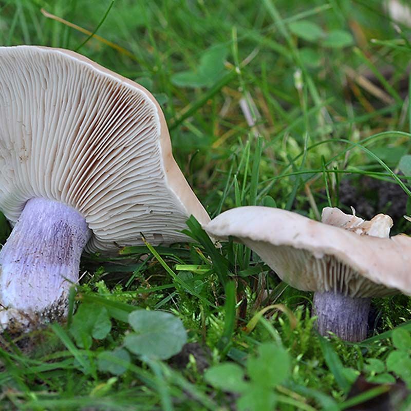 Окраска ножки того же цвета, что и шляпка, обычно серого цвета с фиолетовым или голубым оттенком, по этой особенности гриб имеет название Рядовки лиловоногой. Гриб съедобный, имеет хорошие вкусовые качества, похожими по вкусу с шампиньонами, зачастую грибы используют для приготовления в маринованном виде. Гриб произрастает как сапротроф, но может расти и образовывать с деревом микоризу, данный гриб будет прекрасно расти около любого дерева на приусадебном участке, или на перегное, или других растительных остатках.
