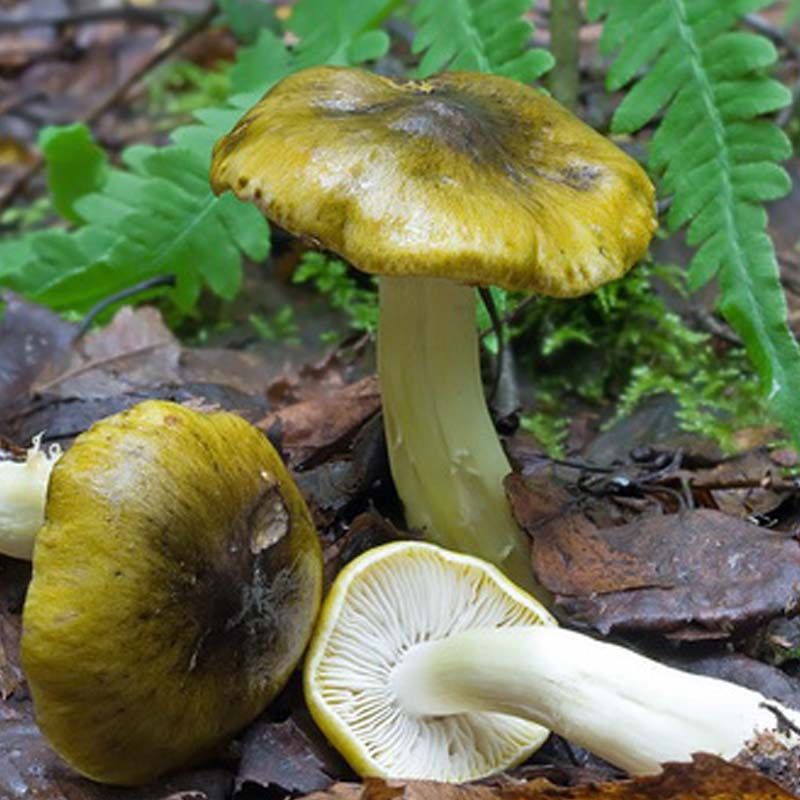 Около основания ножка расширяется, в длину ножка достигает 8 см., в толщину около 2 см. Мякоть гриба окрашена в белый цвет, иногда светло-жёлтого оттенка, имеет горчинку в привкусе, обладает мучным запахом. Окраска спор белого цвета, поверхность у спор гладкая, имеют округлую форму. Слой с пластинками окрашен в белый или серый цвет, широкие, редко расположены.