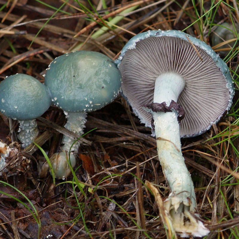 Шляпка калибром 3-8 см, в виде конуса, окрашена в зелено-синий цвет. Со временем она становится светлее. В молодом возрасте, на краях шляпки виднеются останки белого частного покрывала.