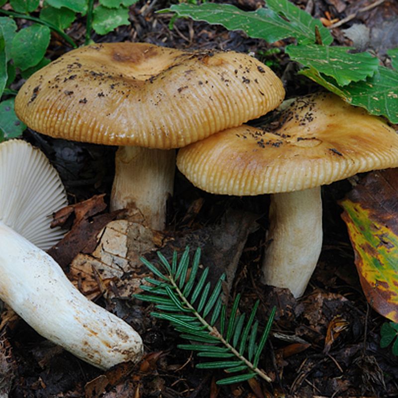 Гриб относится к пластинчатым видам, у пластинок белая окраска, либо бежевого цвета, близко друг от друга расположены. Шляпка может менять окраску, от цвета охры до коричневого оттенка.