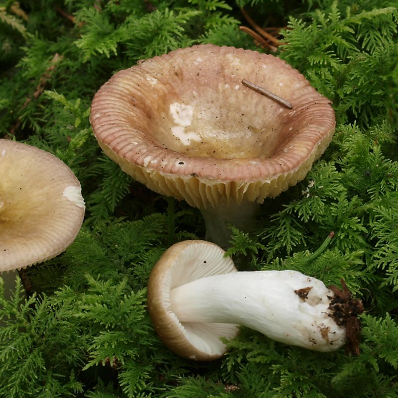 Шляпка может быть окрашена в серо-розовый цвет или с красным оттенком по центру жёлтой окраски. Мякоть гриба белая, легко разламывается, не имеет ярко выраженного запаха.