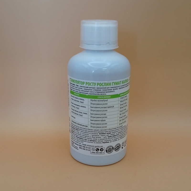 Комплексный препарат для стимуляции формирования корневой системы, стимуляции роста и развития растений. Препарат Гумат Калия + Бор стимулирует образование генеративных органов (бутонов и цветков), уменьшает их осыпания при засухе, что обеспечивает повышение урожайности.