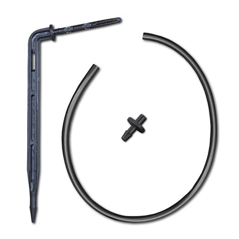 В комплект входит пластиковая прикорневая капельница, для непосредственного полива растений прямо под корень, отрезок трубки 50 см, для подключения к системе подачи воды и адаптер под трубку 4 мм.