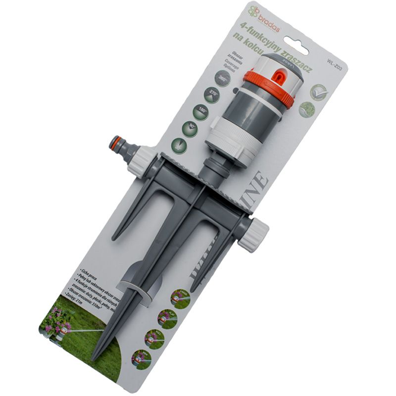Вращающийся ороситель WL-Z03 размещен на крепком пластиковом колышке-тризубе.