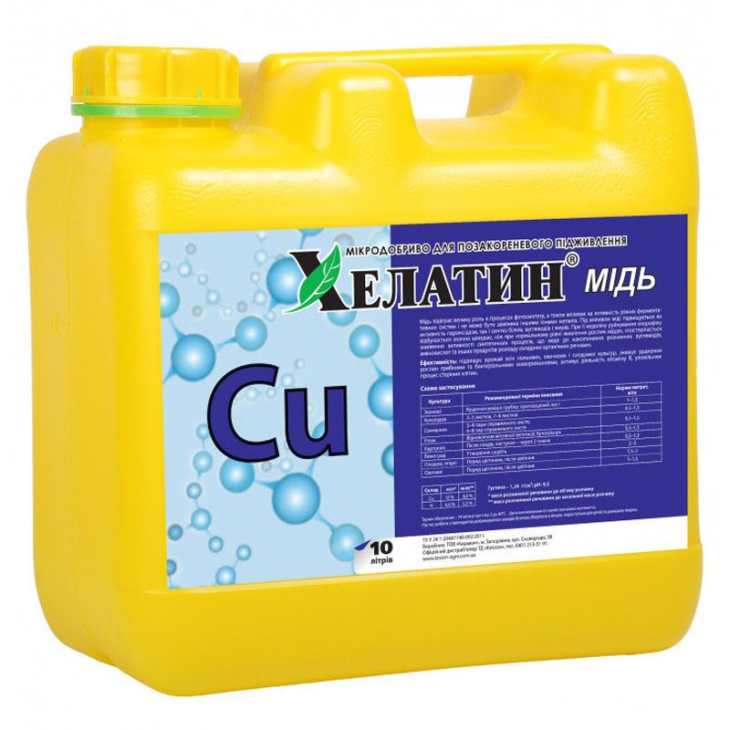 Хелатин медь - формула разработана для применения профилактики хлороза при недостатке меди, для увеличения устойчивости к заболеваниям, климатическим факторам, увеличения урожайности.