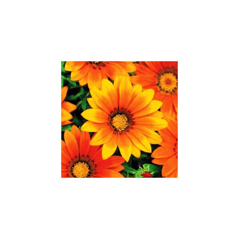В первую очередь данная газания выделяется своими цветками. Они собраны в ярко-оранжевые соцветия с темно-коричневым ободком внутри. Срединка желтая.
