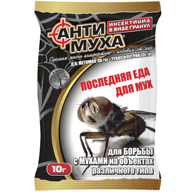 Антимуха-1 - для уничтожения имаго мух, гранулы раскладывают на подложки (крышки) из расчета 2,5 г/1 м2. Одного пакета 10 г достаточно для обработки 4 м2.