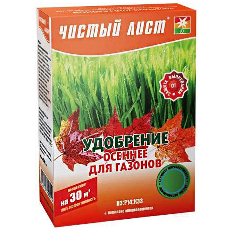 Чистый лист - высокоэффективное, концентрированное, минеральное удобрение содержащее все необходимые элементы питания в доступных формах для газона осеннего периода.