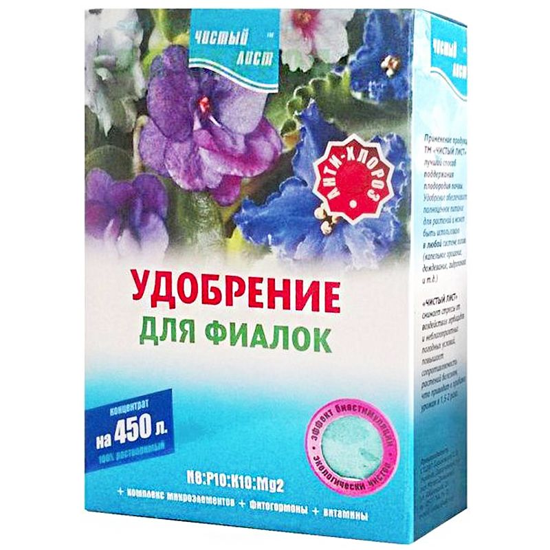 Чистый лист кристаллическое удобрение для фиалок - высокоэффективное, концентрированное, минеральное удобрение содержащее все необходимые для питания растения элементы в доступных формах.