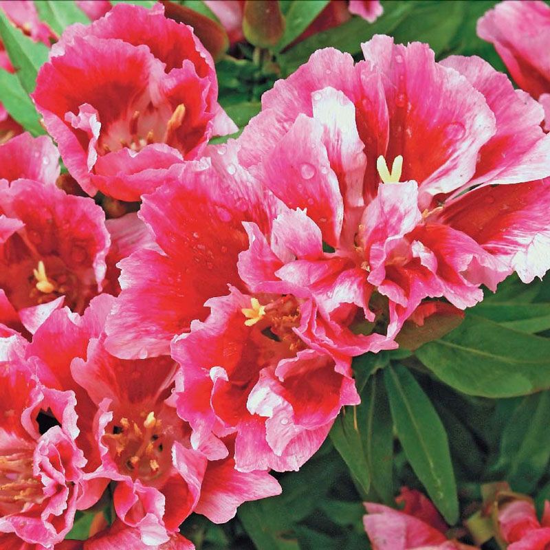 Цветки крупные, махровые, до 6 см в диаметре, розового, белого цвета, собраны в соцветия, которые по форме напоминают азалию. Цветут обильно с июля по октябрь.