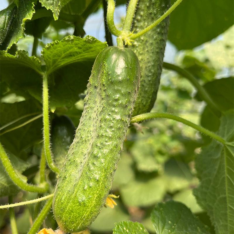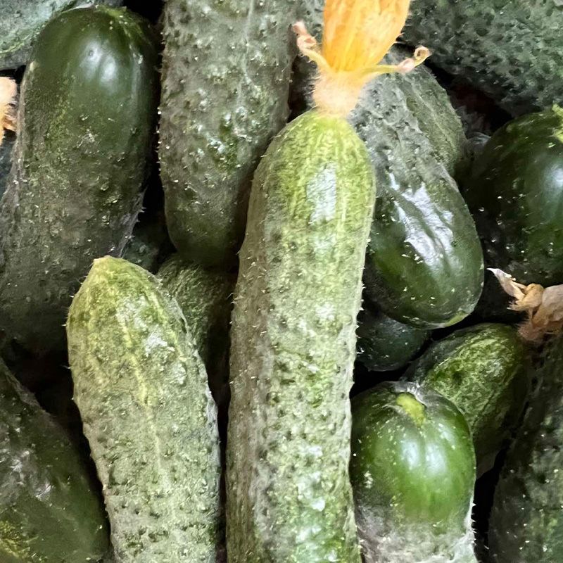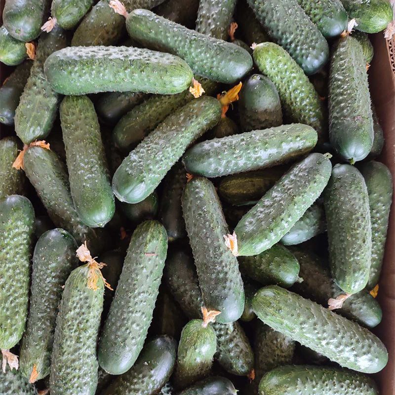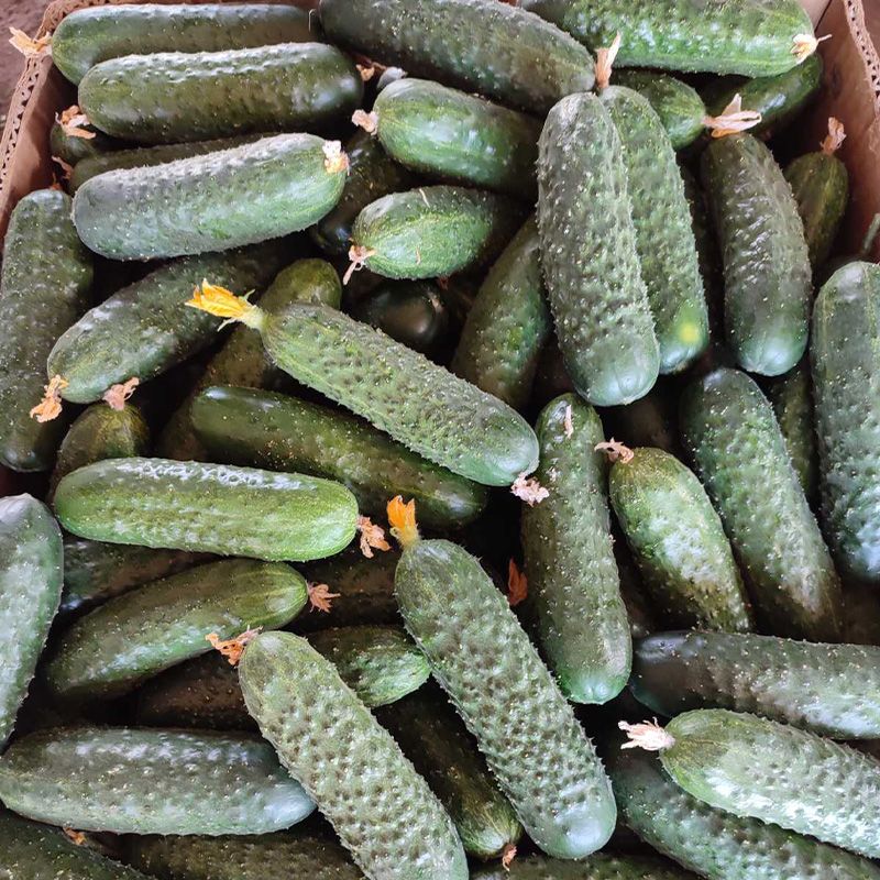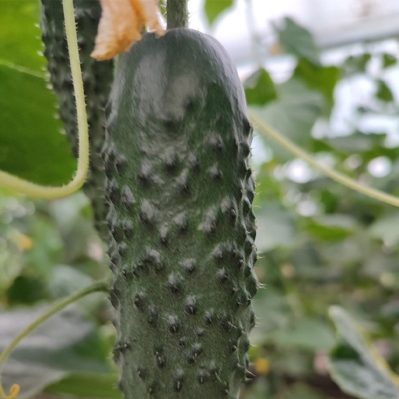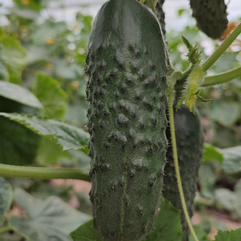 Характеристика плодов – Плоды привлекательного темно-зеленого цвета, без звездочки на конце, хороший шип, длина плода 10-14 см, ширина 3,5 см в среднем. Вес одного плода 100-120 г. Плоды однородные по размеру по всей высоте растения товарной цилиндрической формы, без конусности и ребристости, вкусные и сладкие. Колючка по всей длине огурца.