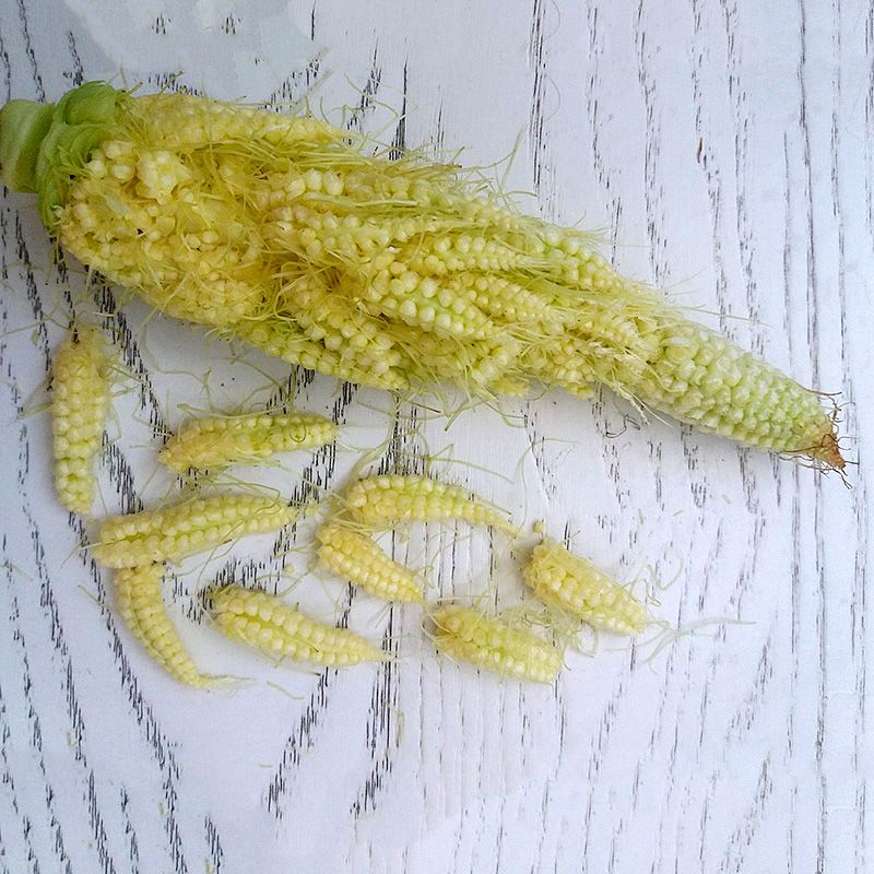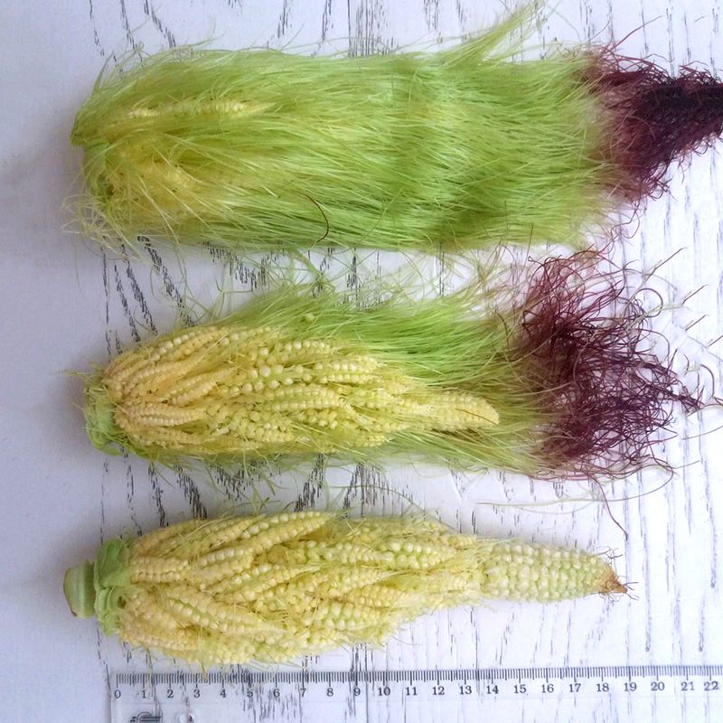 Гибрид выгодно отличается от обычной бэби-корн массой товарной продукции с одного растения. Вместо одного маленького початка на каждом растении развивается по 1-2 крупных ветвистых початка, каждый массой около 200-300 г.