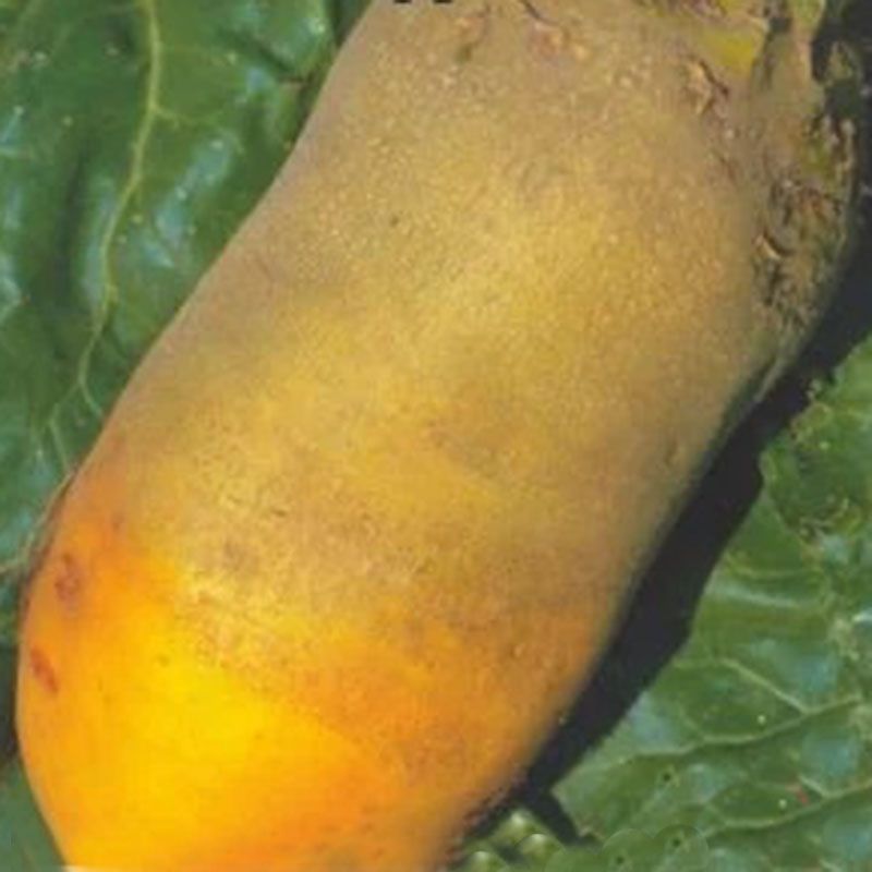 Корнеплоды отличаются выравненностью, цилиндрической формой и весом от 250 до 950 г. Кожура гладкая, надземная часть серо-желтая, а подземная – лимонно-желтая, мякоть желтоватая.