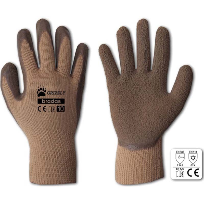 Перчатки защитные Grizzly латекс – плотные трикотажные хлопковые перчатки, которые плотно облегают руку. Латексное покрытие черного цвета имеет складчатую шершавую фактуру, что обеспечивает плотное сцепление с предметами и поверхностями.