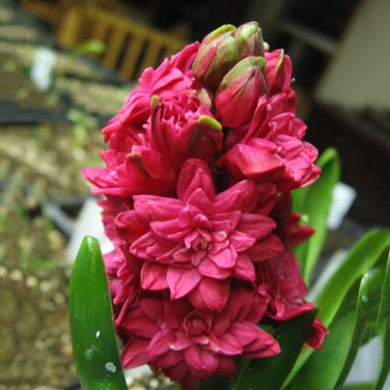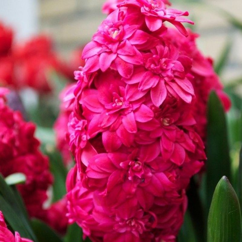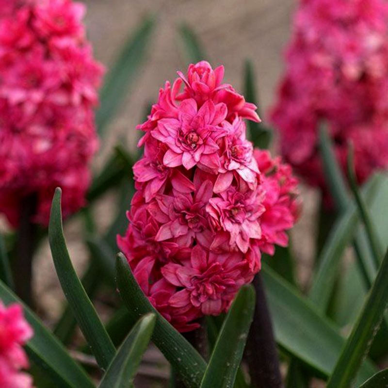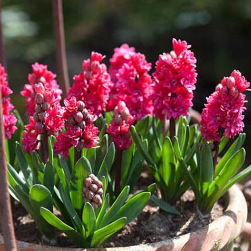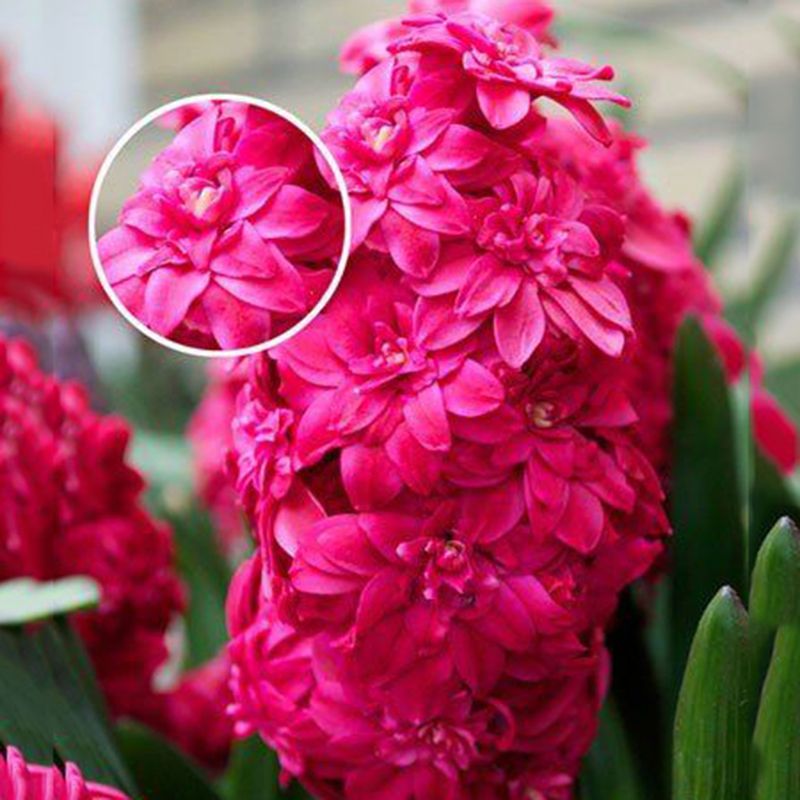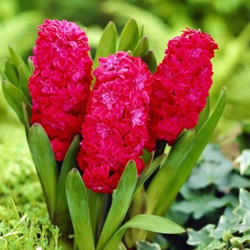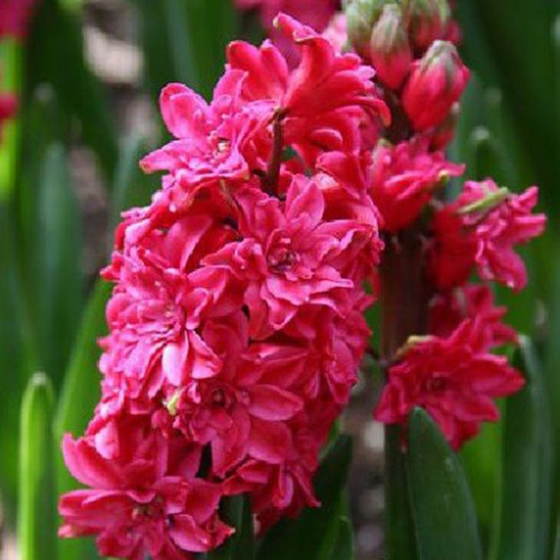 Цветки насыщенного малиново-красного цвета. Соцветия гиацинта располагаются на цветоножках высотой до 20 см. Распускаясь, они принимают вид очень декоративных кудрявых шапочек.