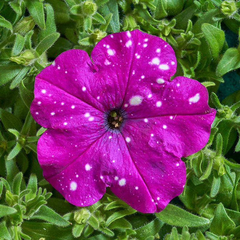Петуния мультифлора Звездное небо (Дот Стар F1) темно-фиолетовая – уникальный гибрид новой серии «Дот Стар F1». Он может принести бесконечную вселенную, звездное небо, тайны космоса, простую радость, веселое настроение на ваших клумбах, подоконниках или в горшках.
