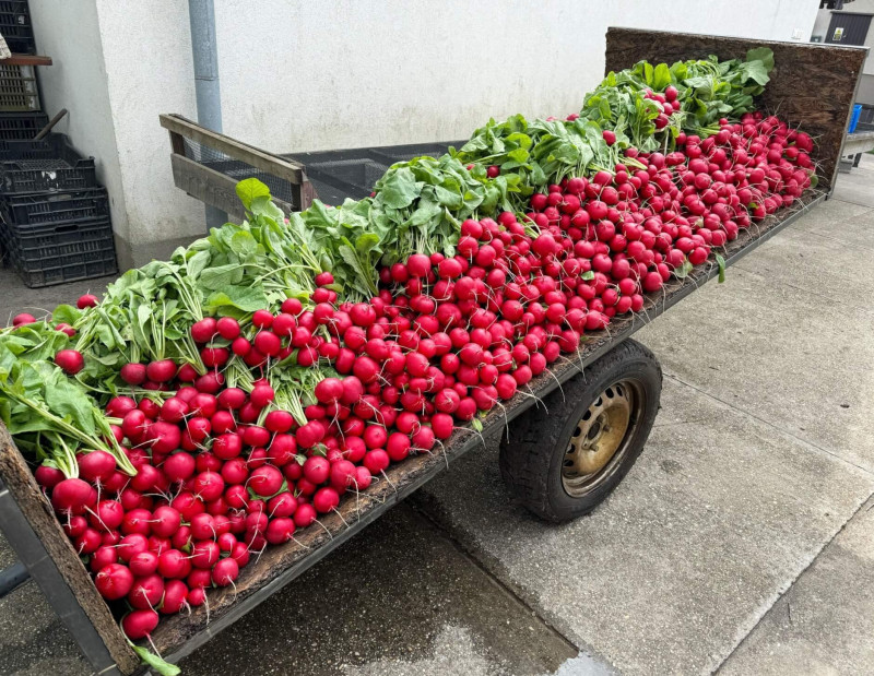 - Корнеплоды: Округлые, ярко-красные с белой, хрустящей мякотью, диаметром 25–35 мм (меньше при густом посеве, больше при разреженном). Однородные по размеру, форме и цвету, с высоким содержанием сухого вещества для хранения до 2–3 недель.
