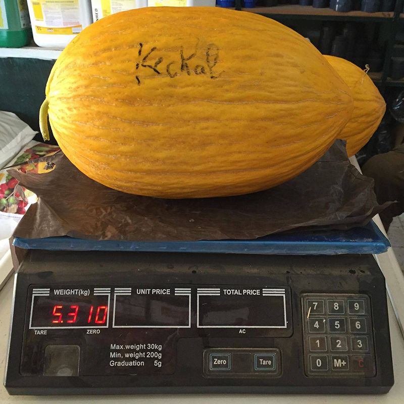 Характеристика плодов – Плоды овальные, со значительной ребристостью поверхности, массой – 3-5 кг. Ярко-желтый цвет кожуры и высокая товарность плодов. Мякоть белая, сочная, содержание сахара – 12-13%.