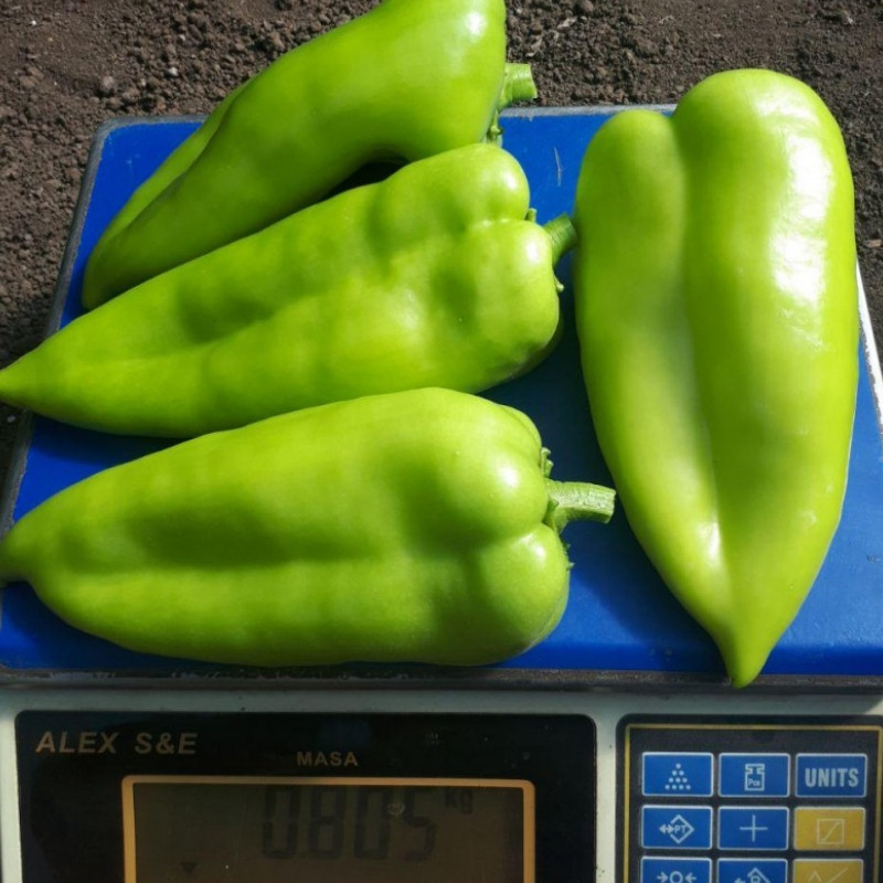 Характеристика плодов – Плоды конической формы, длиной 17 см. Толщина стенки – 5-7 мм. Цвет в технической спелости – светло-зеленый, в биологической – красный. Вес – 170-200 г.